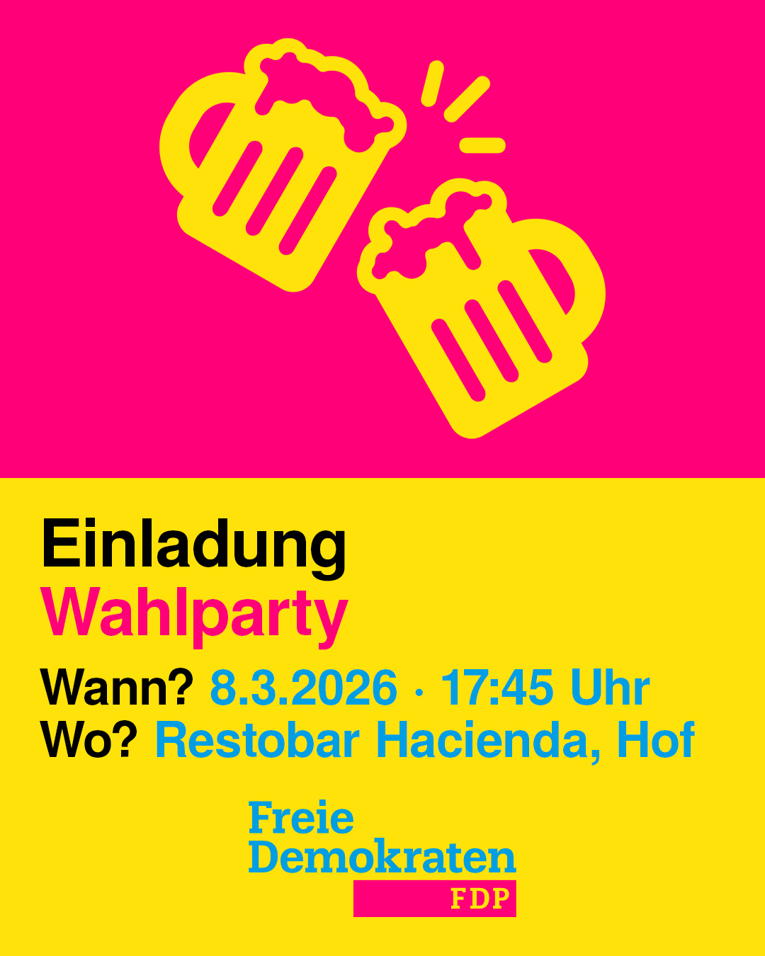 Nach der Kommunalwahl ist vor der Wahlparty: Wir laden ein! Wann? Sonntag, 8.3.2026 · 17:45 Uhr Wo? Restobar Hacienda (Pfarr 2, 95028 Hof) Wer bei hervorragendem mexikanischem Essen einen anstrengendenund zugleich aufbauenden Wahlkampf mit uns feiern will, soll einfach vorbeischauen. #kommunalwahl #wahlparty #fdphof #stadthof #hofsaale